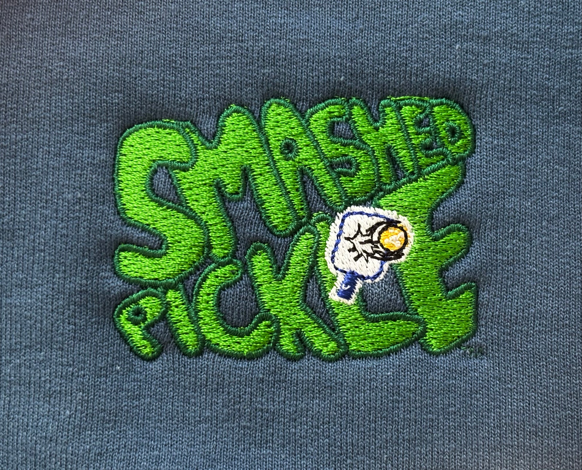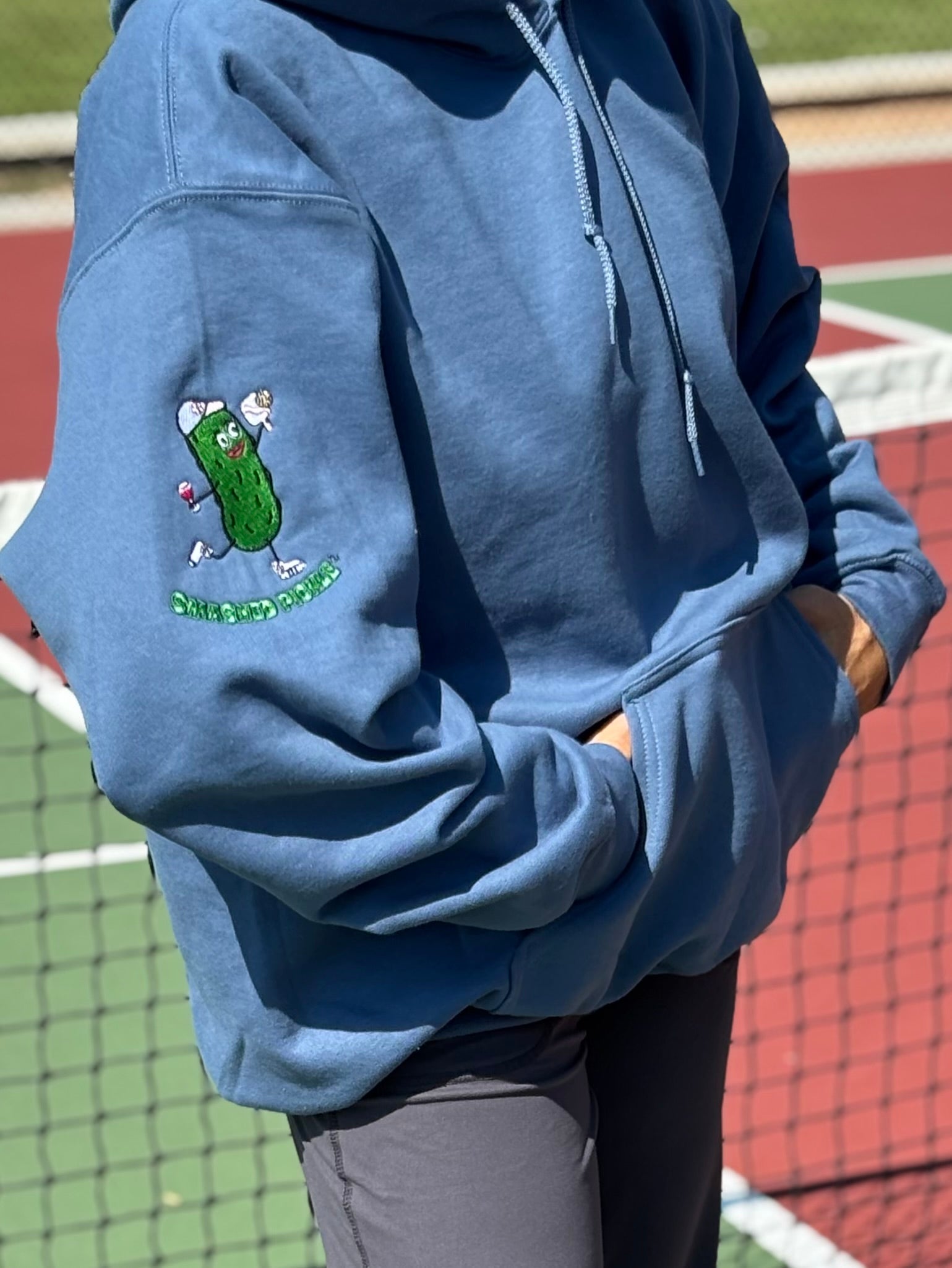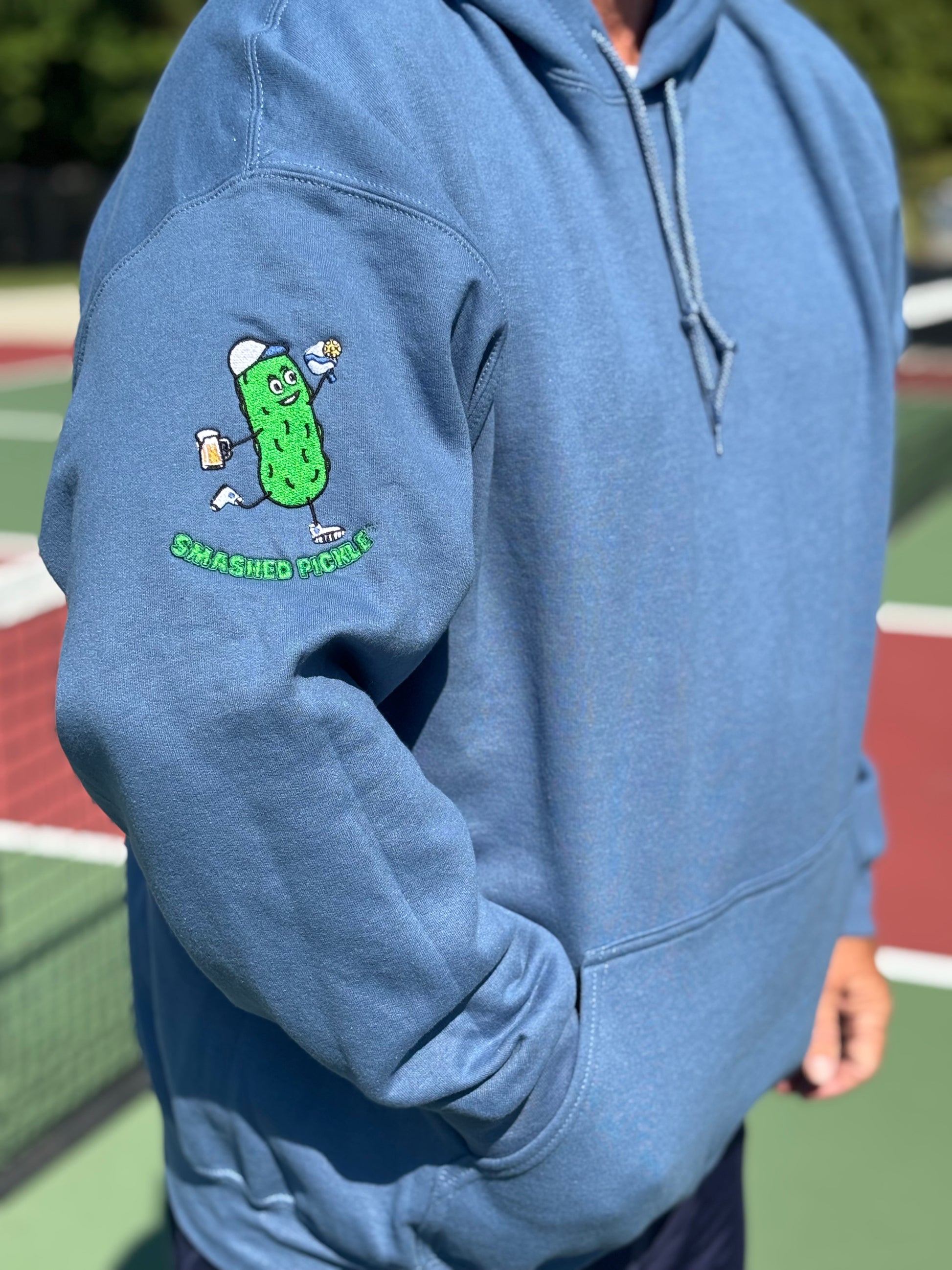 A cozy, soft, relaxed fit and durable sweatshirt with your choice of embroidered logo. (Smashed Pickle with wine logo, Smashed Pickle with beer logo, and Smashed Pickle with paddle logo) The sweatshirt's hood is double lined with matching drawstring. It has a pouch pocket and the 50/50 cotton polyester blend and pill resistant air jet yarn reduces pilling.