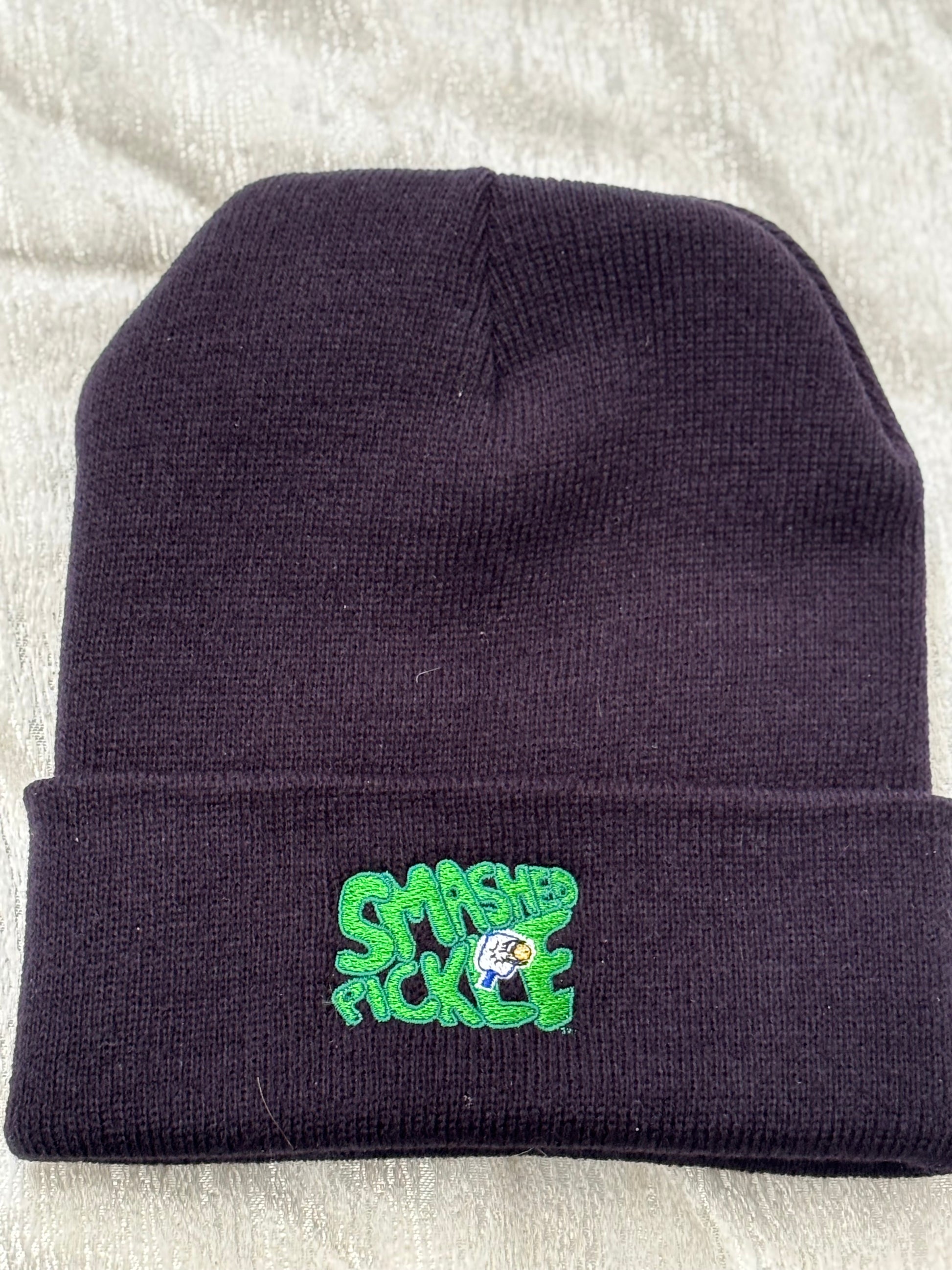 Ski Knit Beanie with Smashed Pickle Logo on front. Made in USA.